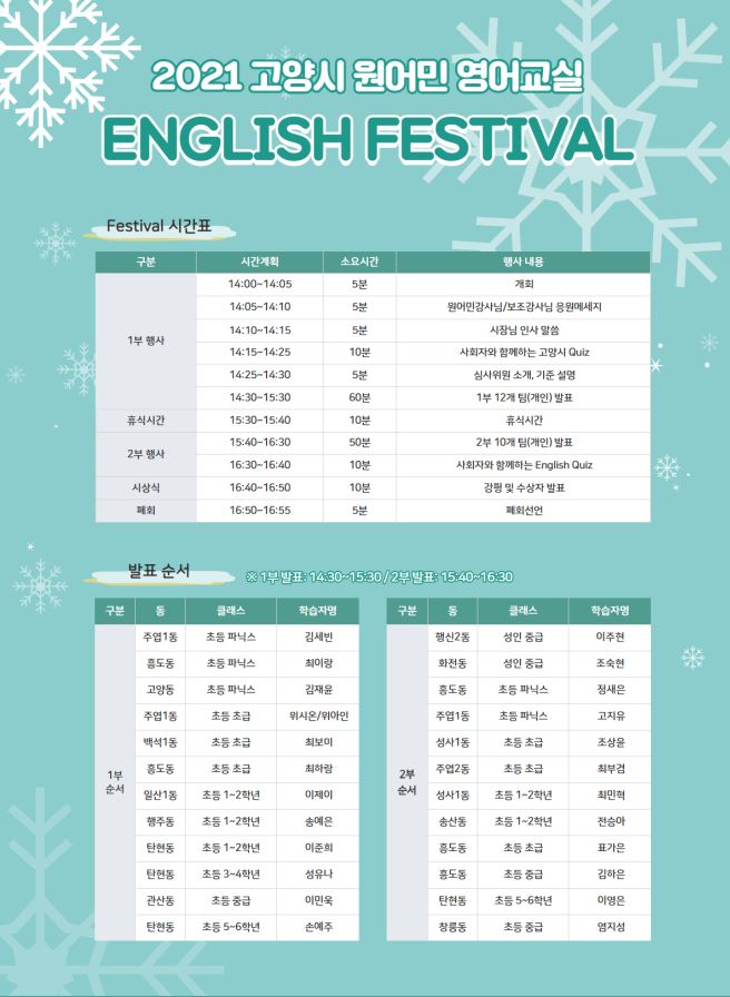 2021 고양시 원어민 영어교실 ENGLISH FESTIVAL 시간 및 발표 순서