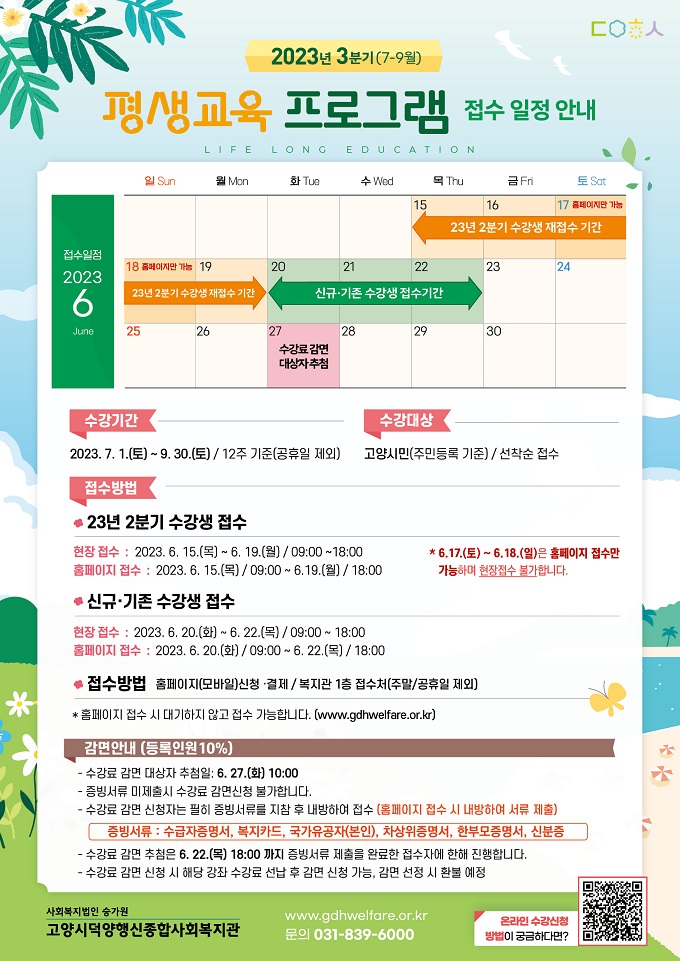 고양시 덕양행신종합사회복지관에서 2023년 3분기 평생교육 프로그램을 접수합니다.