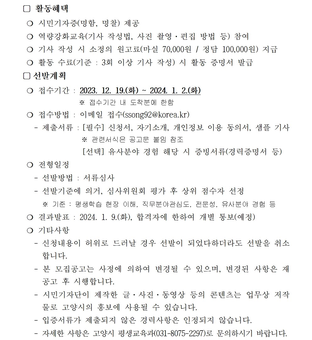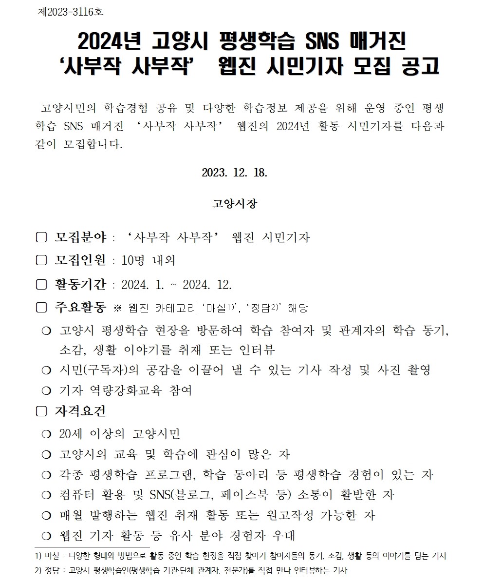 2024년 고양시 평생학습 SNS 매거진 시민기자 모집 공고