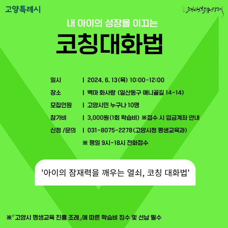 ▶ 신청 : 고양시청 평생교육과 031-8075-2278 (평일 9:00~18:00 전화접수)