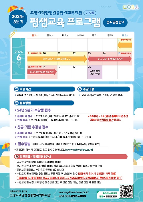 고양시덕양행신종합사회복지관에서 2024년 3분기 평생교육 프로그램을 접수합니다.